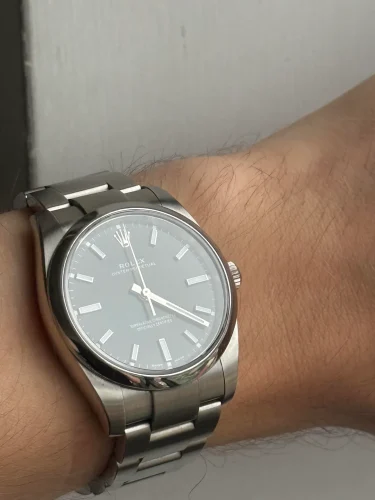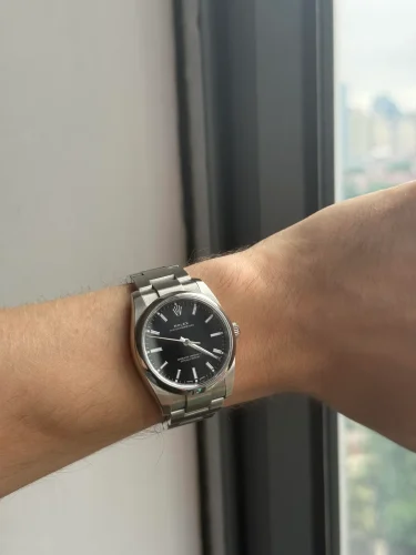 As you clasp the adjustable?Oyster bracelet?around your wrist, secured by the sturdy 904L stainless steel folding?Oyster clasp, you feel the comfort and security that comes with exceptional craftsmanship. The black dial, paired with sleek?stick indices?and?stick hands?also made from 904L stainless steel, exudes a minimalist elegance that enhances its versatility in both casual and formal settings.