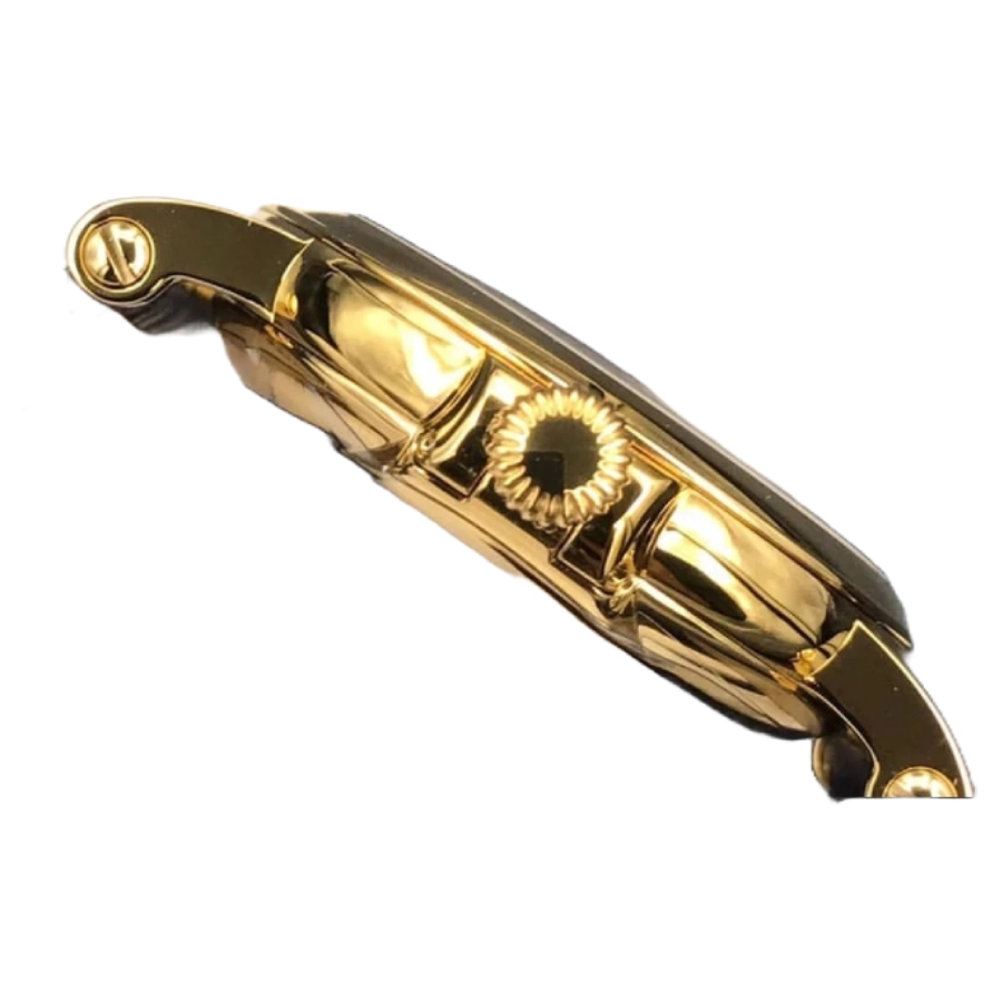 The brown leather strap complements the warm tones of the bezel, and the adjustable design ensures a comfortable fit for any wrist. It is finished with a 904L stainless steel fold clasp in matching yellow gold, securing the watch with style and confidence.